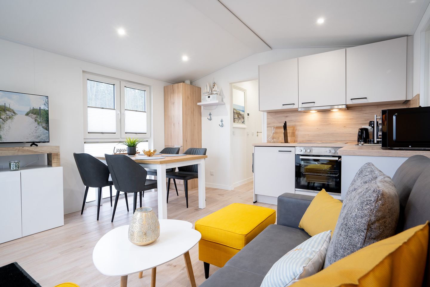 Im Inneren des Ferienhauses finden Sie eine gut ausgestattete Küche, in der Sie Ihre Lieblingsgerichte zubereiten können. Das Badezimmer ist modern und komfortabel ausgestattet. Das offene Wohn- und Esszimmer lädt zu gemeinsamen Mahlzeiten und gemütlichen Abenden ein. Das Ferienhaus "Liegeplatz" ist der ideale Ort, um familiäre Geborgenheit zu erleben.