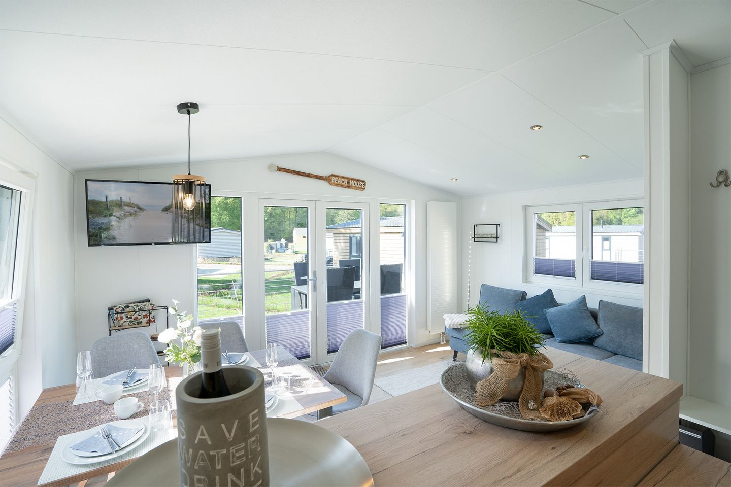 Das Wohnzimmer mit einem gemütlichen Sofa und einem Essplatz für 4 Personen bildet den Mittelpunkt des Hauses.