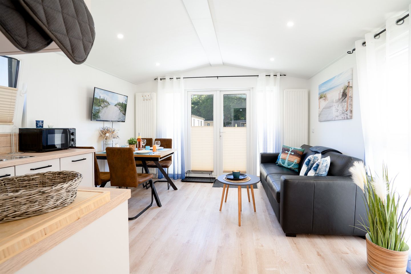 Das Ostseecamp Küstenkind verfügt über insgesamt 3 Zimmer, darunter 2 komfortable Schlafzimmer, die mit einem hochwertigen Vinylboden ausgestattet sind, und ein einladendes Wohnzimmer, das durch seine offene Gestaltung mit der Küche harmonisch verbunden ist. Hier genießen Sie nicht nur den Blick auf die Umgebung, sondern auch die gesellige Atmosphäre, die das gemeinsame Kochen und Beisammensein zu einem besonderen Erlebnis macht. Die moderne Küche ist vollständig ausgestattet inklusive Herd, Backofen, Spülmaschine und allen notwendigen Küchenutensilien. Hier finden Sie alles, was Sie zur Zubereitung Ihrer Mahlzeiten benötigen. Ein Essbereich ist ebenfalls vorhanden und lädt dazu ein, gesellige Abendessen zu genießen.